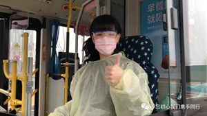 2月24日2路第一天恢復(fù)運(yùn)營,每部參運(yùn)車輛多出一名隨車體溫檢測員,王穎跟丈夫分在同車組。早晨6:00,夫妻倆已經(jīng)到2路始發(fā)站唐山站,開始出車前的準(zhǔn)備工作:檢查完車輛安全,再打掃干凈衛(wèi)生,噴灑消毒液對車廂每處角落進(jìn)行徹底消殺。王穎跟丈夫一對一天輪流開車、進(jìn)行登記,從唐山站行駛到啟新立交橋后,就要停留兩分鐘嚴(yán)格落實(shí)一車次一消毒。遇見急躁的乘客,王穎就耐心勸導(dǎo);有不明白的老年乘客想乘車,她也總不厭其煩地解釋溝通。