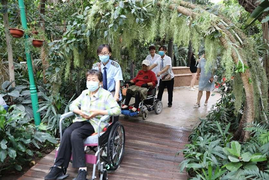 隨后,志愿者和護(hù)工們推著輪椅上的截癱休養(yǎng)員、挽著智障兒童,乘坐兩輛新能源低踏板公交車來到南湖景區(qū)植物風(fēng)情館參觀游覽。一行人漫步在高大茂盛的熱帶植物叢林中,志愿者按照標(biāo)識耐心地為截癱休養(yǎng)員和智障兒童講解植物信息,愉快的交談引得歡聲笑語久久回蕩。“現(xiàn)在城市發(fā)展越來越快,公交車也越來越舒適了,雖然離南湖很近,但是我們出來不方便,這次能出來看看,真是特別感謝。”一位截癱休養(yǎng)員高興地說。